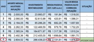 Antes de mais nada é importante destacar que a planilha fará os reajustes de forma automática, tanto nos aportes mensais como no valor de renda passiva alvo de acordo com a inflação média anual inserida na tabela de dados de entrada. Por esta razão todos os anos o aporte será ajustado para o valor equivalente ao valor de aporte inicial e a renda passiva alvo será o equivalente a renda esperada, porém corrigida pela inflação.