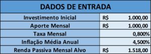 Para este exemplo, vamos partir do pressuposto de que o investidor irá fazer um aporte inicial de R$ 1000 e aportes mensais de R$ 1000, aplicados a uma taxa de 0,8%, inflação média anual de 4,5% e com objetivo de atingir um salário mínimo R$ 1.518 (valor base do ano de 2025) em renda passiva mensal, conforme ilustrado na tabela de dados de entrada.